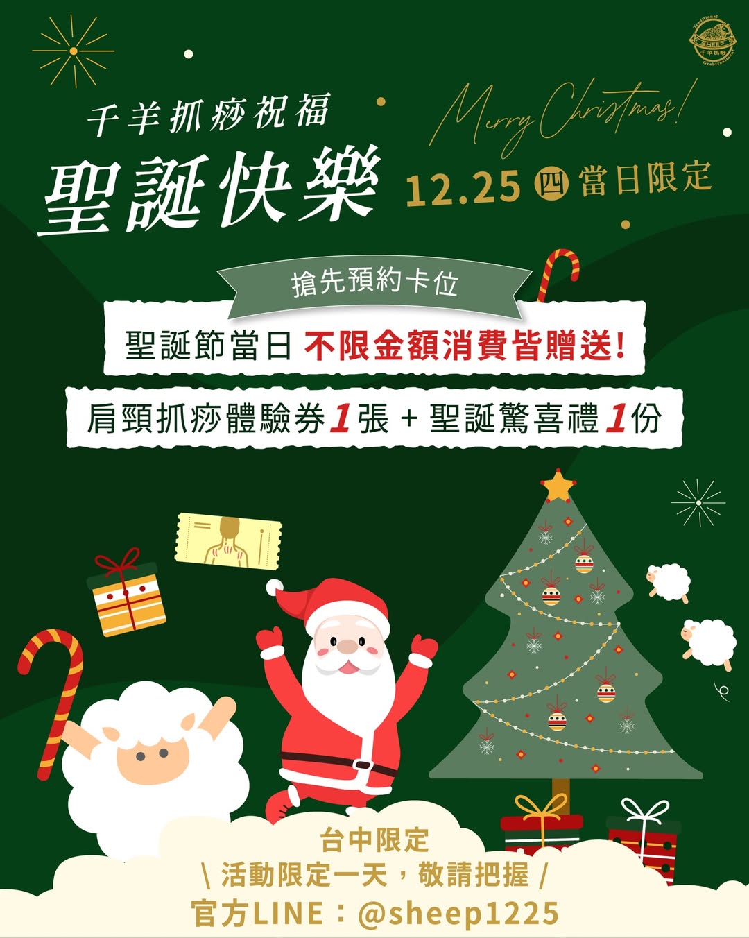 🎅🏻 𝓗𝓸 𝓗𝓸 𝓗𝓸 !! #聖誕快樂 千羊送上最真摯的聖誕節祝福~🎄 年末的溫馨節日中,擁有最舒服、放鬆的時刻💝 凡 12/25㊃ 聖誕節當日消費(不限金額) 🎉 即贈肩頸抓痧體驗券1張 + 聖誕禮物1份 🎉 ‼️台中總店限定活動 #今年的最後一個暖心節慶 一起在抓痧中放鬆、重整能量💫 📩 抓痧預約 ➜ 官方LINE:@sheep1225 ▶ FB 🔎 千羊抓痧 ▶ IG 🔎 @sheep_esther
