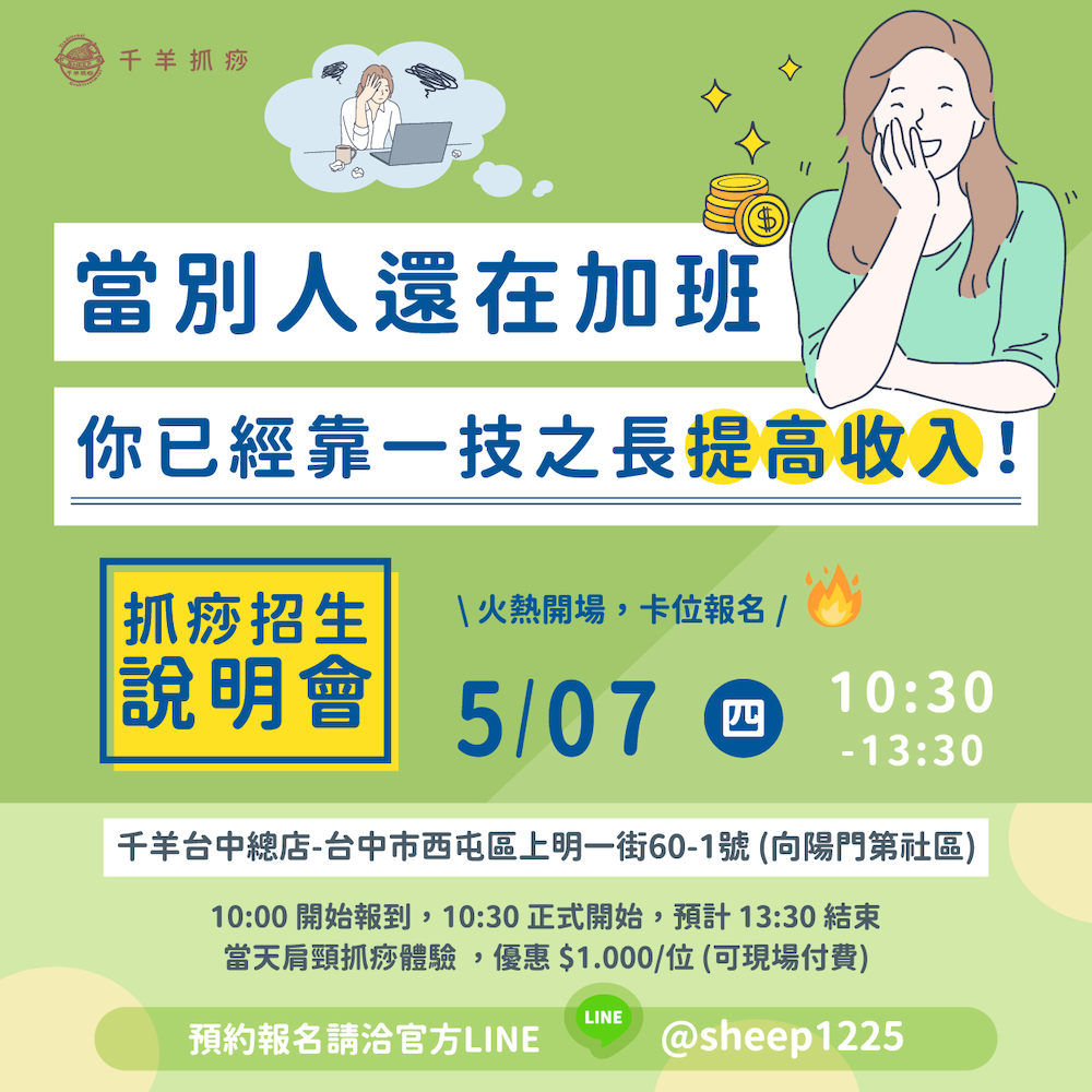 二度就業、家庭主婦都可以學習抓痧,且時間彈性由你作主!