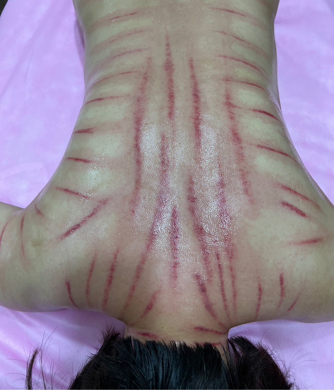 這位女個案透過痧痕判斷出應該有風濕等問題困擾,第一張就是過敏反應比較大經常有慢性發炎等問題。透過定期抓痧,幫助身體代謝循環提升防護力,抓後身體輕盈讓精神也飽滿。畫面看來驚嚇,但五至七天就會連帶你一身的疲累,靜悄悄地消褪得無影無蹤。