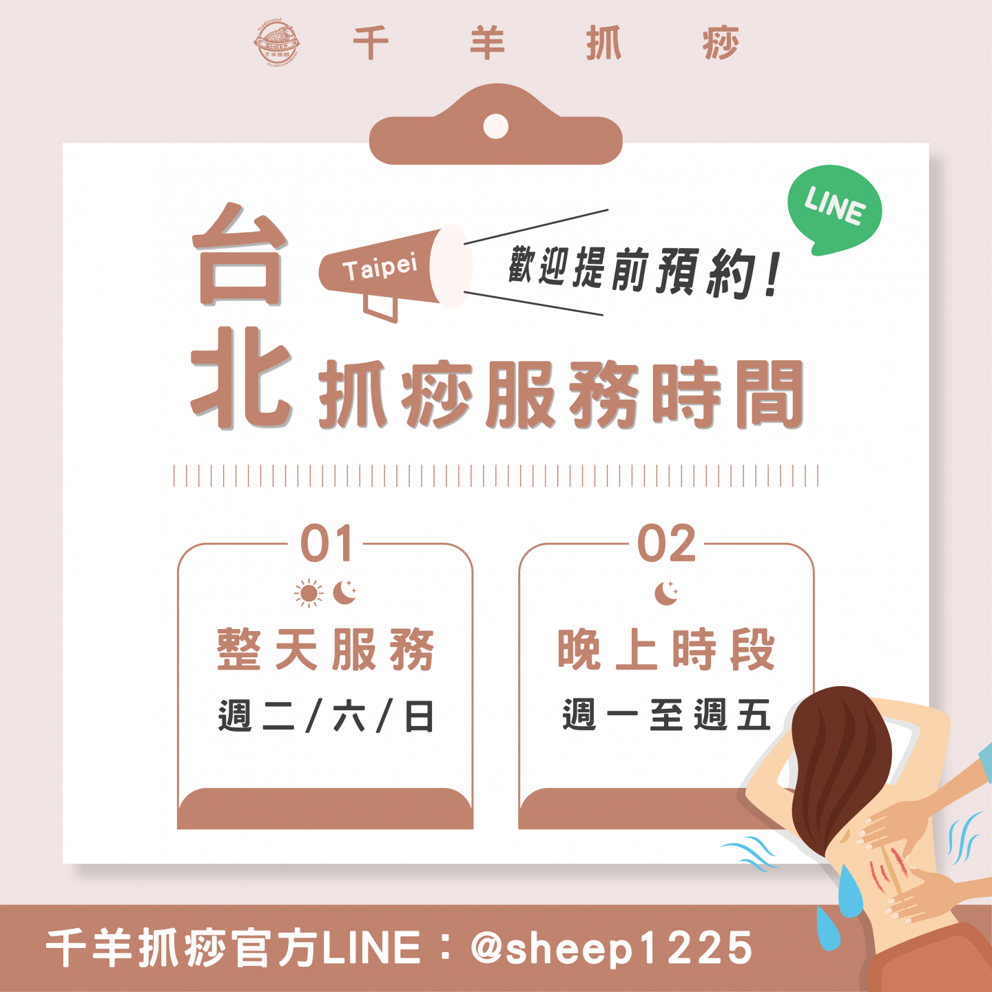 📢北部的朋友~養好健康才有力氣繼續拼! #台北抓痧 服務時間 👐🏻 📍 千羊抓痧・台北服務時間 ▸ 晚上時段|週一至週五 ▸ 整天服務|週二、六、日 每天忙得團團轉?肩頸緊到像背著一座山😖 生活步調太快,別忘了照顧自己的健康! ✨很多抓痧的客人都說:「抓完放鬆不少!也睡得比較沉~」 ✔ 放鬆肌肉、舒緩緊繃 ✔ 促進循環、排出濕氣 ✔ 改善睡眠、氣色紅潤 ✔ 頭肩頸不再卡卡,整個人都順起來! ▎記得提前預約哦!▎ 讓千羊的雙手陪你找回元氣與健康❤️
