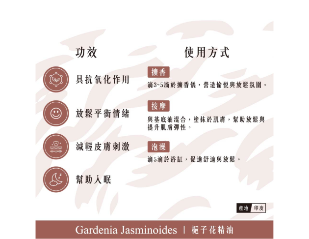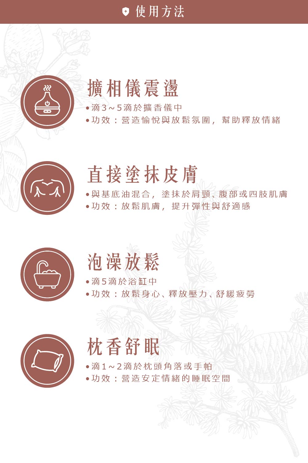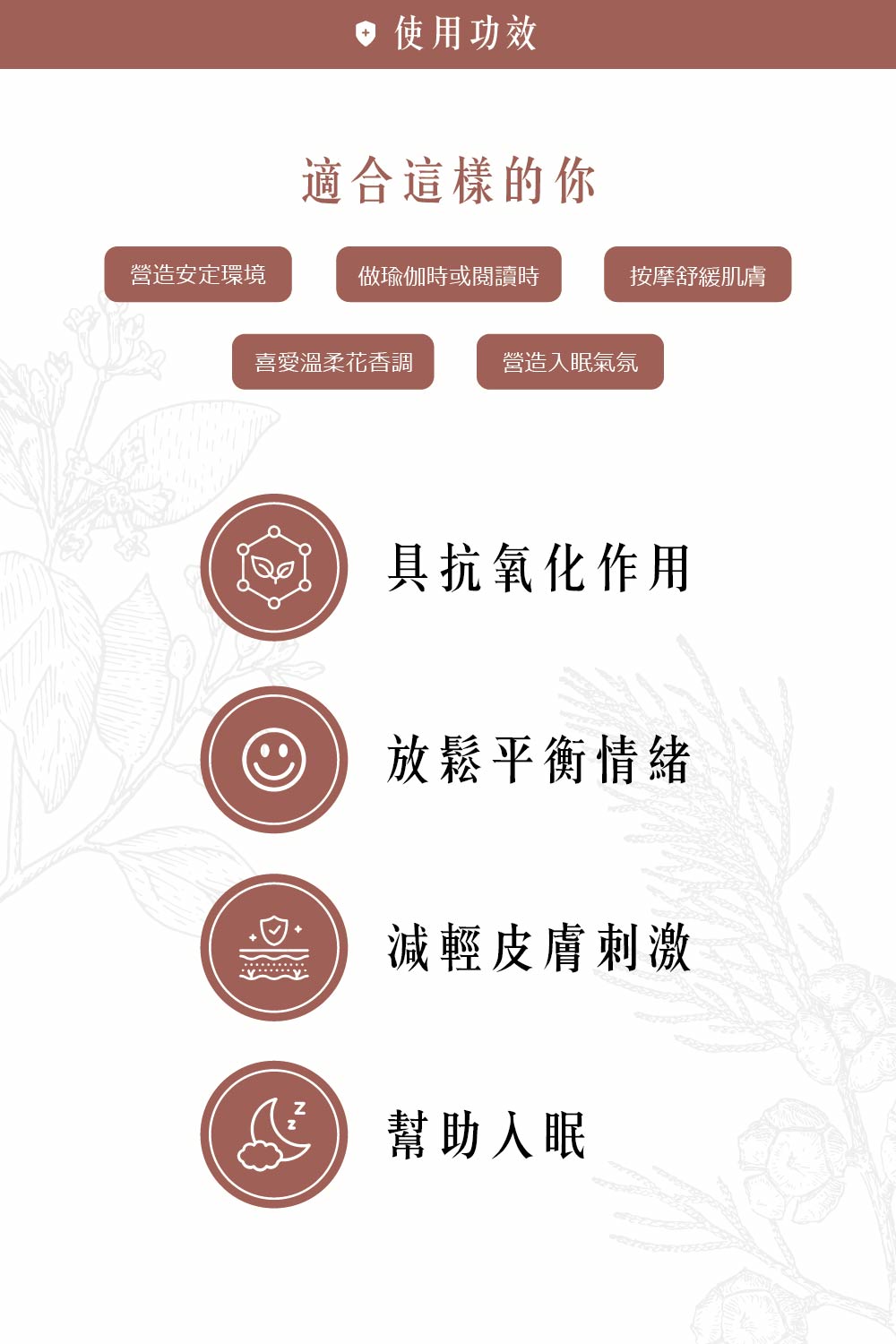主要是具抗氧化作用、能夠放鬆平衡情緒、減輕皮膚刺激及幫助入眠等功效。