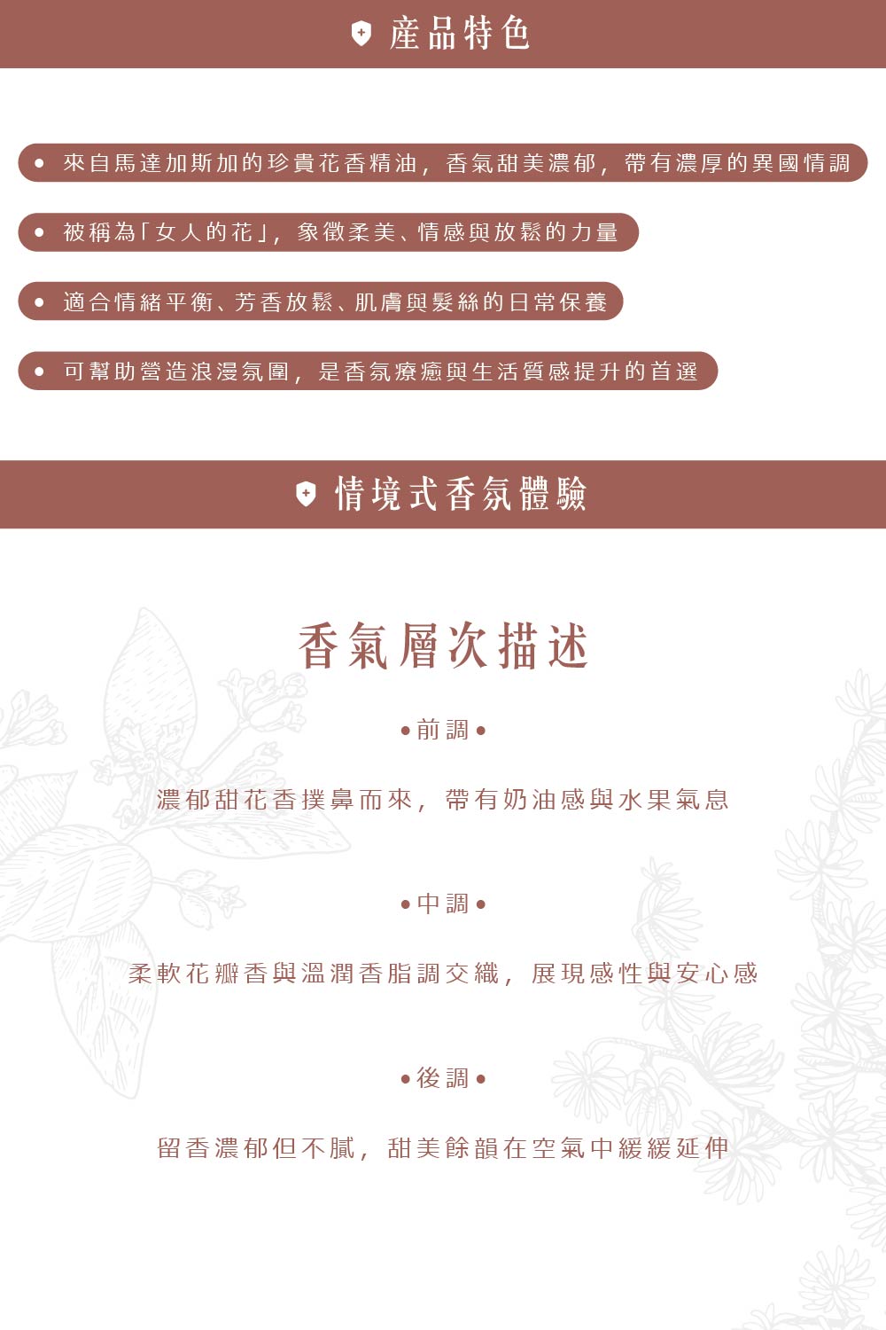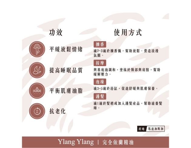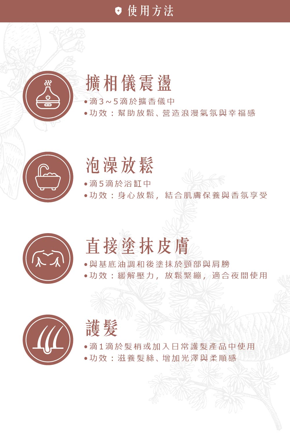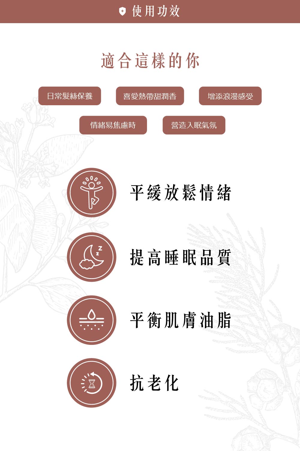 主要能平衡放鬆情緒、提高睡眠品質、平衡肌膚油脂、抗老化等功效