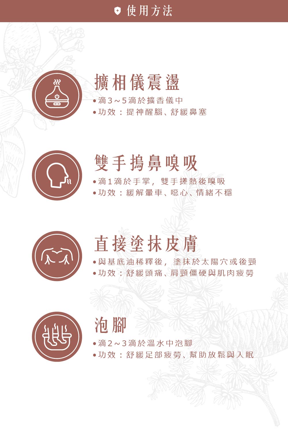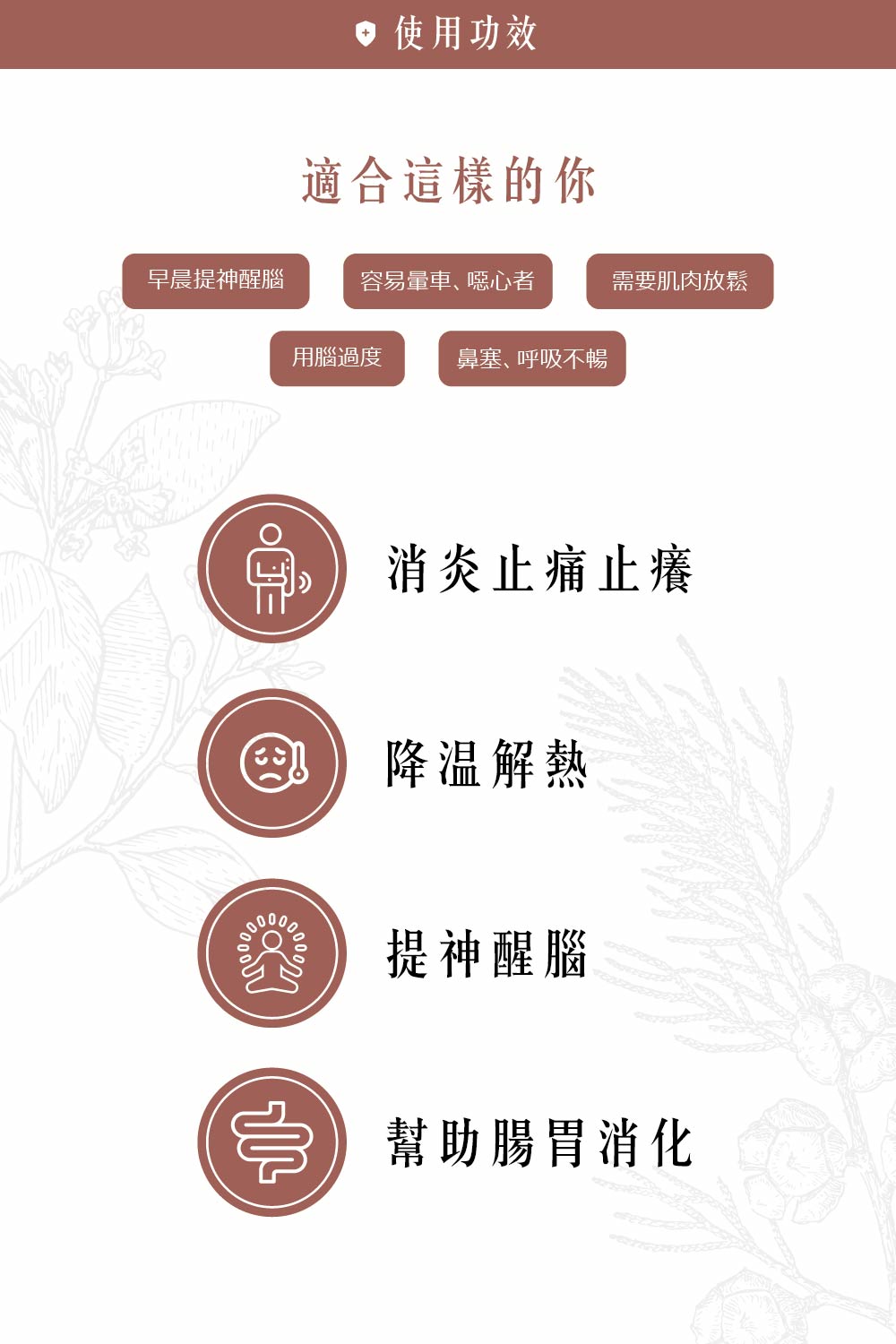 主要是針對抑菌、降發炎、頭痛、脹氣、呼吸道不舒服可以使用